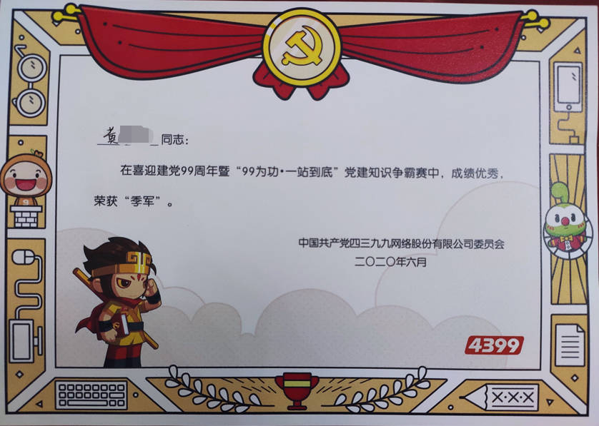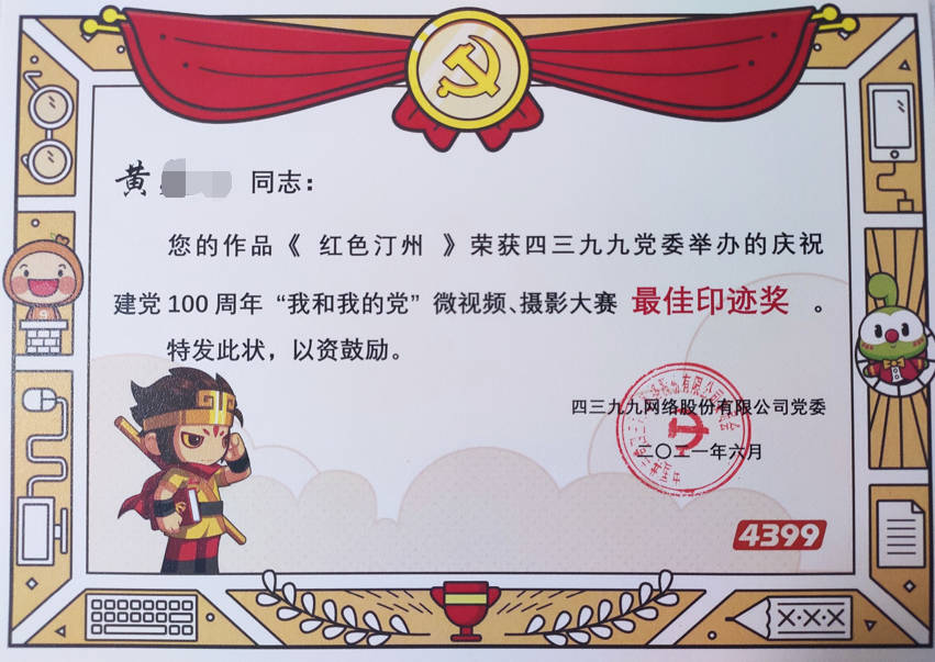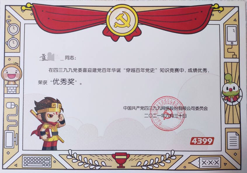 - 2021-06《穿越百年党史知识竞赛优秀奖》——中共四三九九网络股份有限公司党委