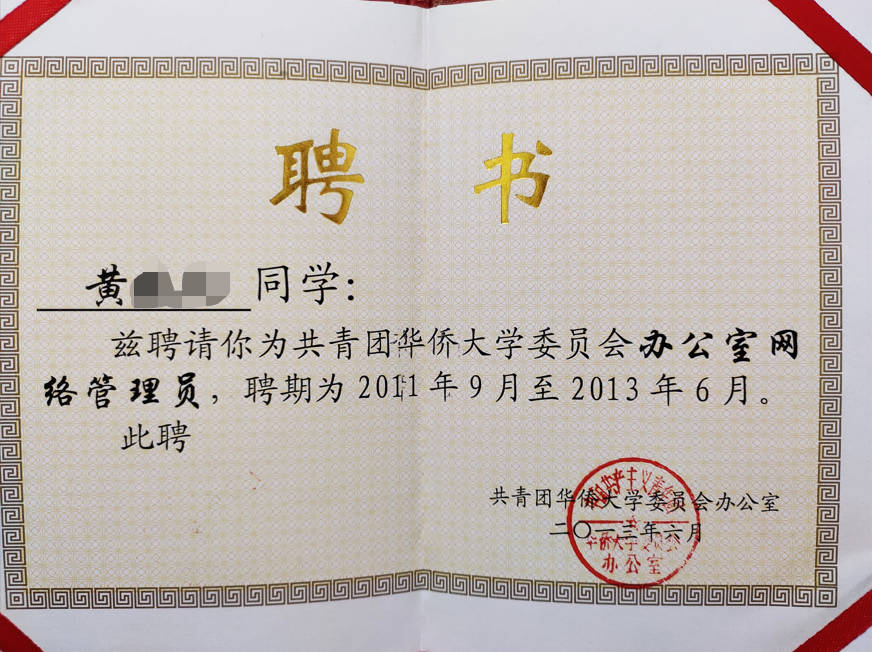 - 2013-06《校团委办公室网络管理员》聘书——华侨大学校团委办公室