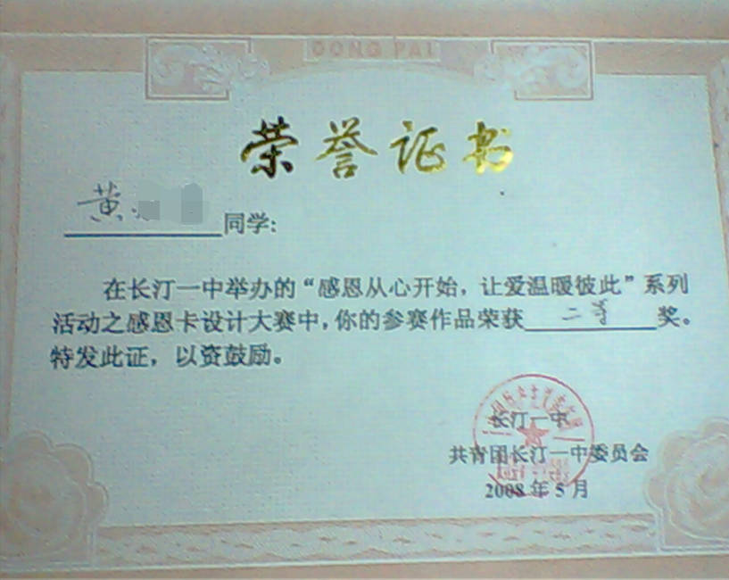 - 2008-05《感恩卡设计大赛二等奖》——长汀一中