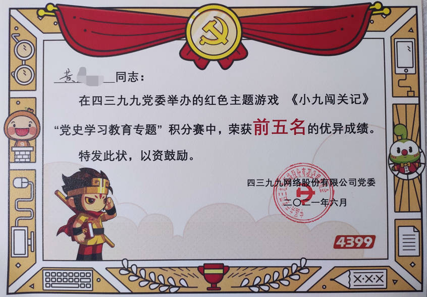 - 2021-06《小九闯关记·党史学习教育专题积分赛前五名》——中共四三九九网络股份有限公司党委