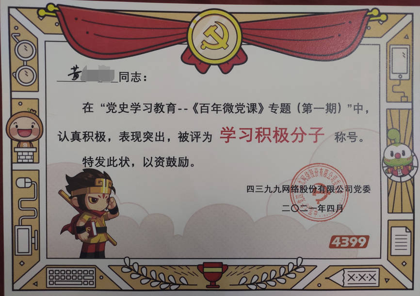 - 2021-04《百年微党课》学习积极分子——中共四三九九网络股份有限公司党委