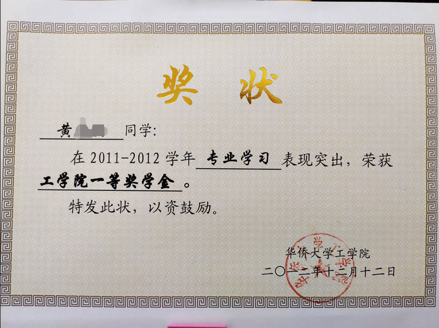 - 2012-12《院一等奖奖学金》——华侨大学工学院