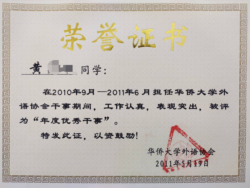 - 2011-05《年度优秀干事》——华侨大学外语协会