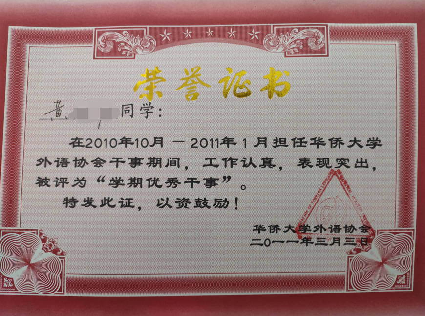 - 2011-03《学期优秀干事》——华侨大学外语协会