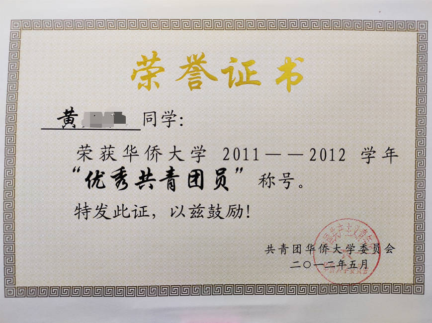 - 2012-05《优秀共青团员》——共青团华侨大学委员会