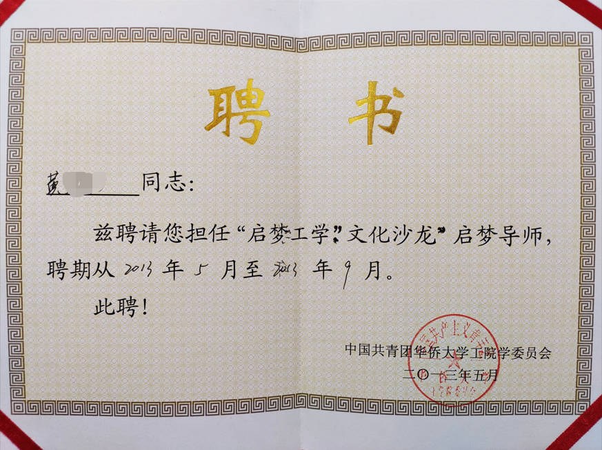 - 2013-05《启梦导师》聘书——华侨大学工学院