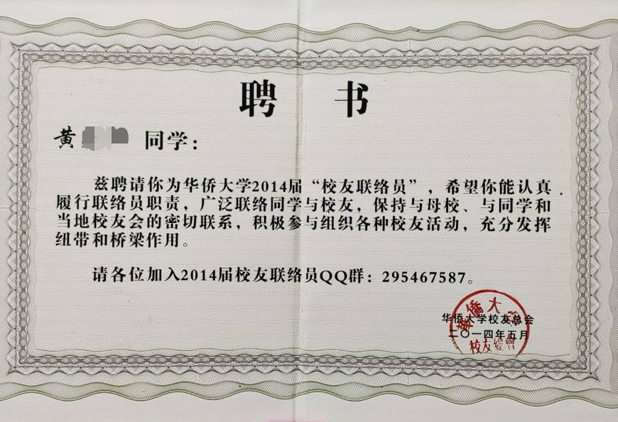 - 2014-05《校友联络员》聘书——华侨大学校友总会