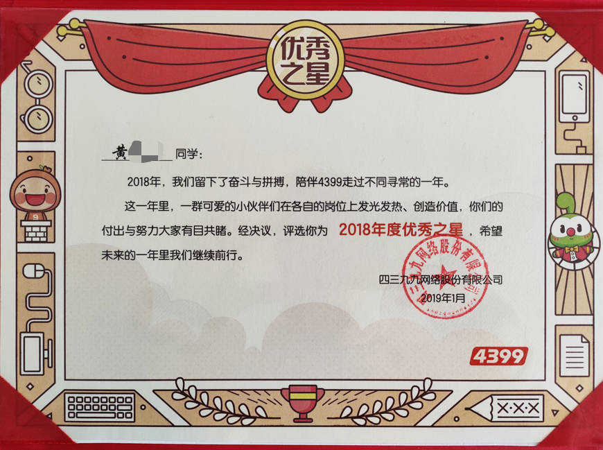 - 2019-01《2018年度优秀之星》——四三九九网络股份有限公司