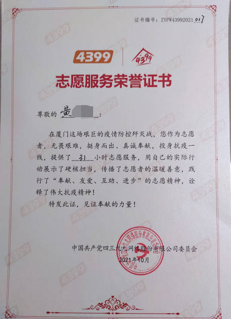 - 2021-10《疫情防控志愿服务证书》——中共四三九九网络股份有限公司党委