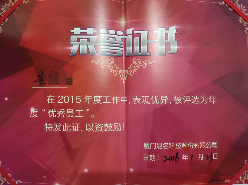 - 2016-01《2015年度优秀员工》——厦门易名科技股份有限公司