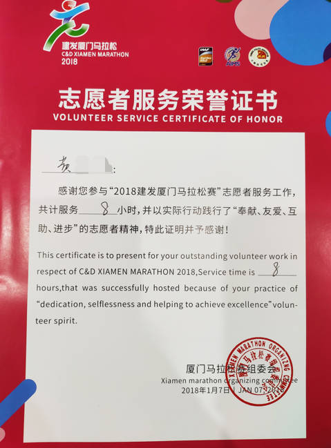 - 2018-01《厦门马拉松志愿服务证书》——厦门马拉松赛组委会