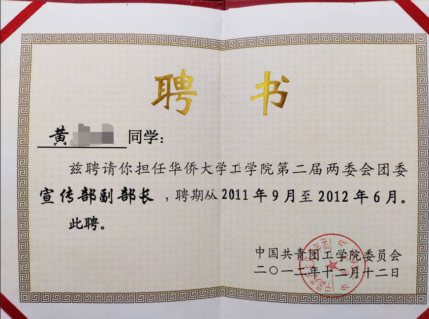 - 2012-12《华侨大学工学院第二届两委会团委宣传部副部长》聘书——华侨大学工学院